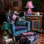 We’re not the ones to keep this delicious detail to ourselves. The Moonlight Garden Off the Record Wing Chair is in full bloom, featuring a dark and delicious floral velvet print, reminiscent of an Old Masters painting, over a domestic hardwood frame. Contrasting fabrics include a flocked teal velvet brocade on the sides and a violet velvet boucle on the loose cushion, trimmed with harlequin check cording in navy and gold. The chair’s front legs get their personality from our artisans in Aurora, New York, who have masterfully added hand-painting, gold leaf, and transfers.